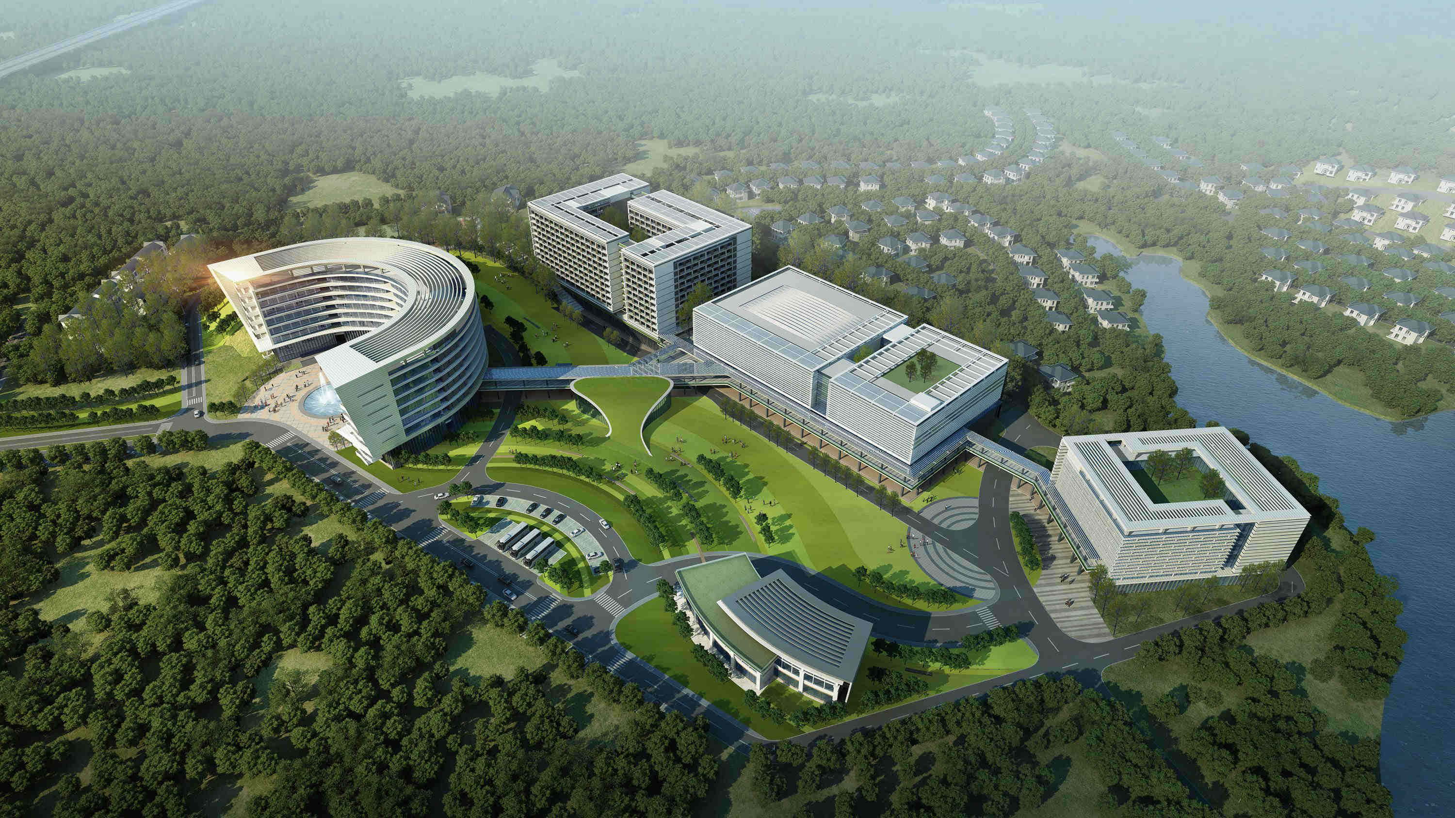 南航综合培训中心占地面积160亩,建设总规模13.8万平方米,由通用教学楼、展览楼、学员宿舍楼、乘务实训楼及综合服务楼5栋连廊综合体和配套训练服务设施构成。